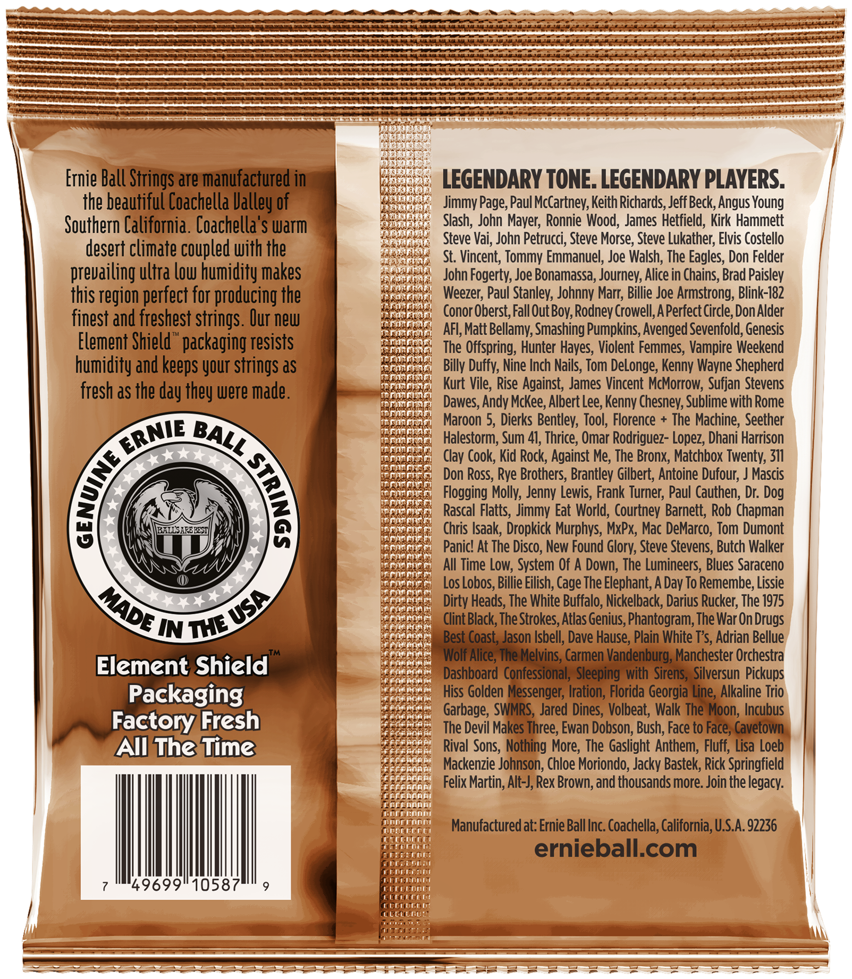 Earthwood Phosphor Bronze Saiten bestehen aus einem Wickeldraht aus 92% Kupfer, 7,7% Zinn und 0,3% Phosphor um einen verzinnten, sechskantigen Stahlkern. Ihre Farbe ist hell orange-gold und ihr Ton weich, glockig und sehr klar.